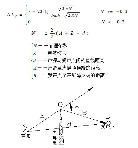 點聲源:一無限長聲屏障,點聲源的繞射聲衰減為: